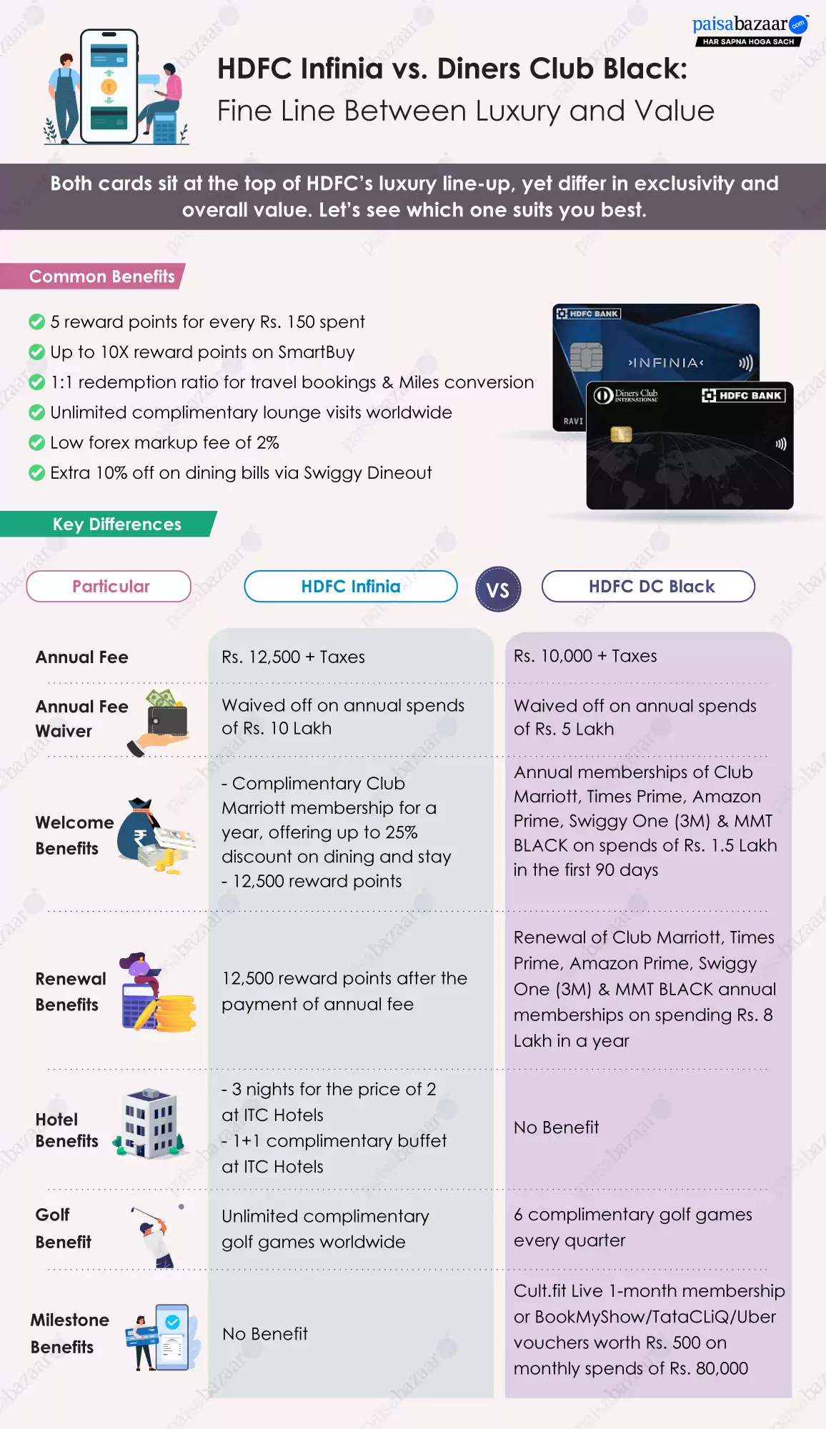 Being an invite-only card, HDFC Infinia is designed for HNIs seeking luxury lifestyle benefits, whereas HDFC Diners Club Black, offered at a comparatively lower annual fee, is the best suited alternative with similar benefits.