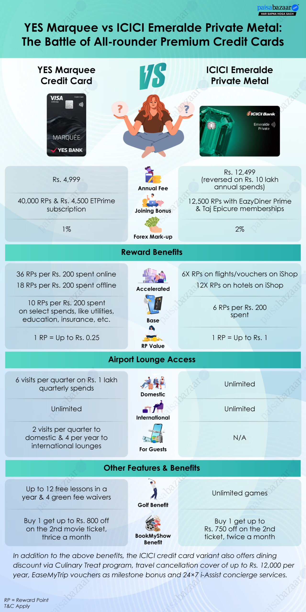 - Domestic Lounge Access: YES Marquee offers up to 24 visits per year, max. 6 per quarter, on spending Rs. 1 lakh in the previous quarter, while ICICI Emeralde Private Metal offers unlimited visits per year.
