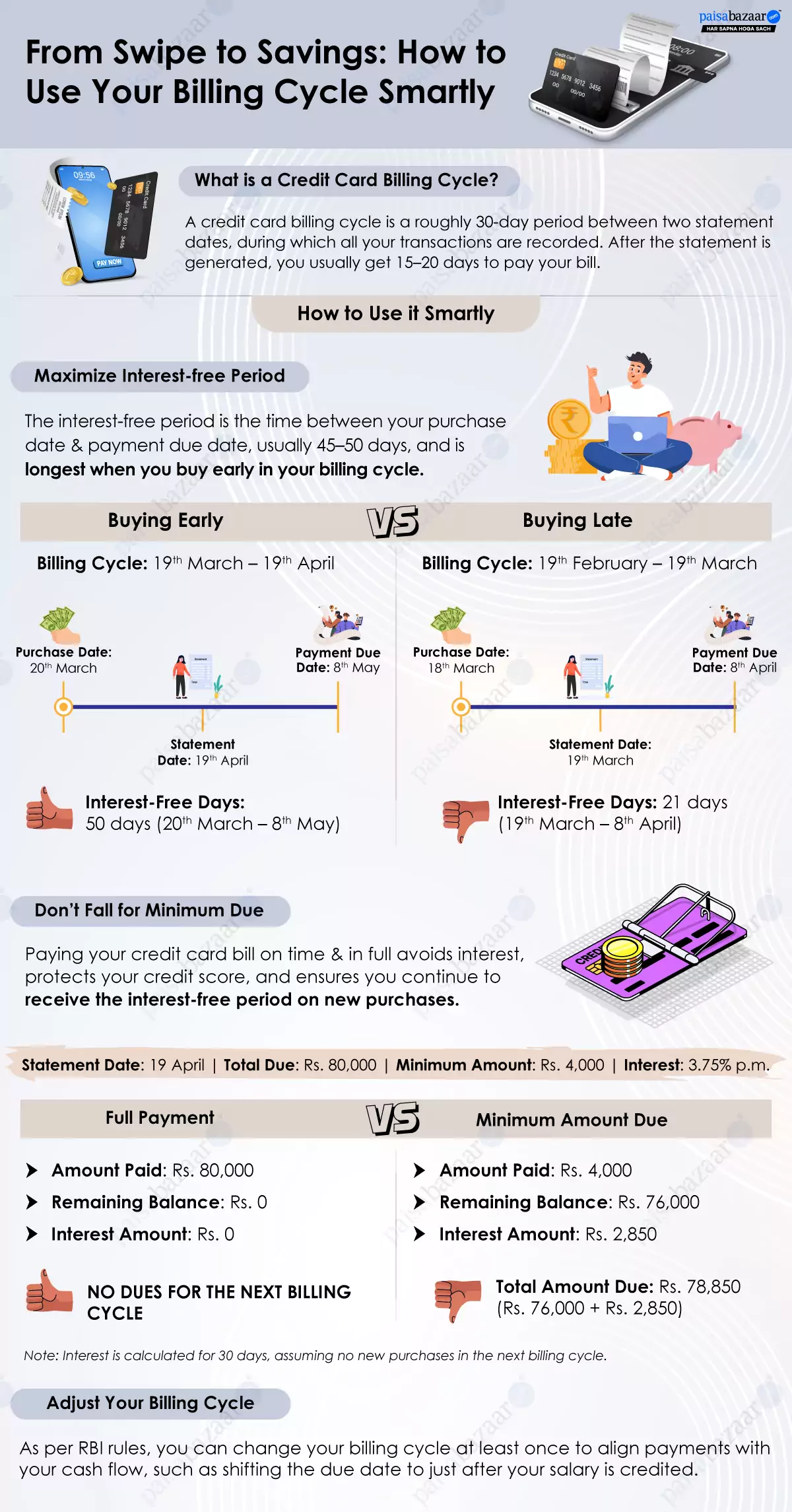 Moreover, many consumers think that paying only the minimum amount due is enough. However, when you pay the minimum due, interest is levied on the unpaid balance, and all the new purchases also become ineligible for the interest-free period and attract finance charges from the day of making the purchase. Thus, it is important to pay your bills on time and in full to maximize your credit card billing cycle benefits.