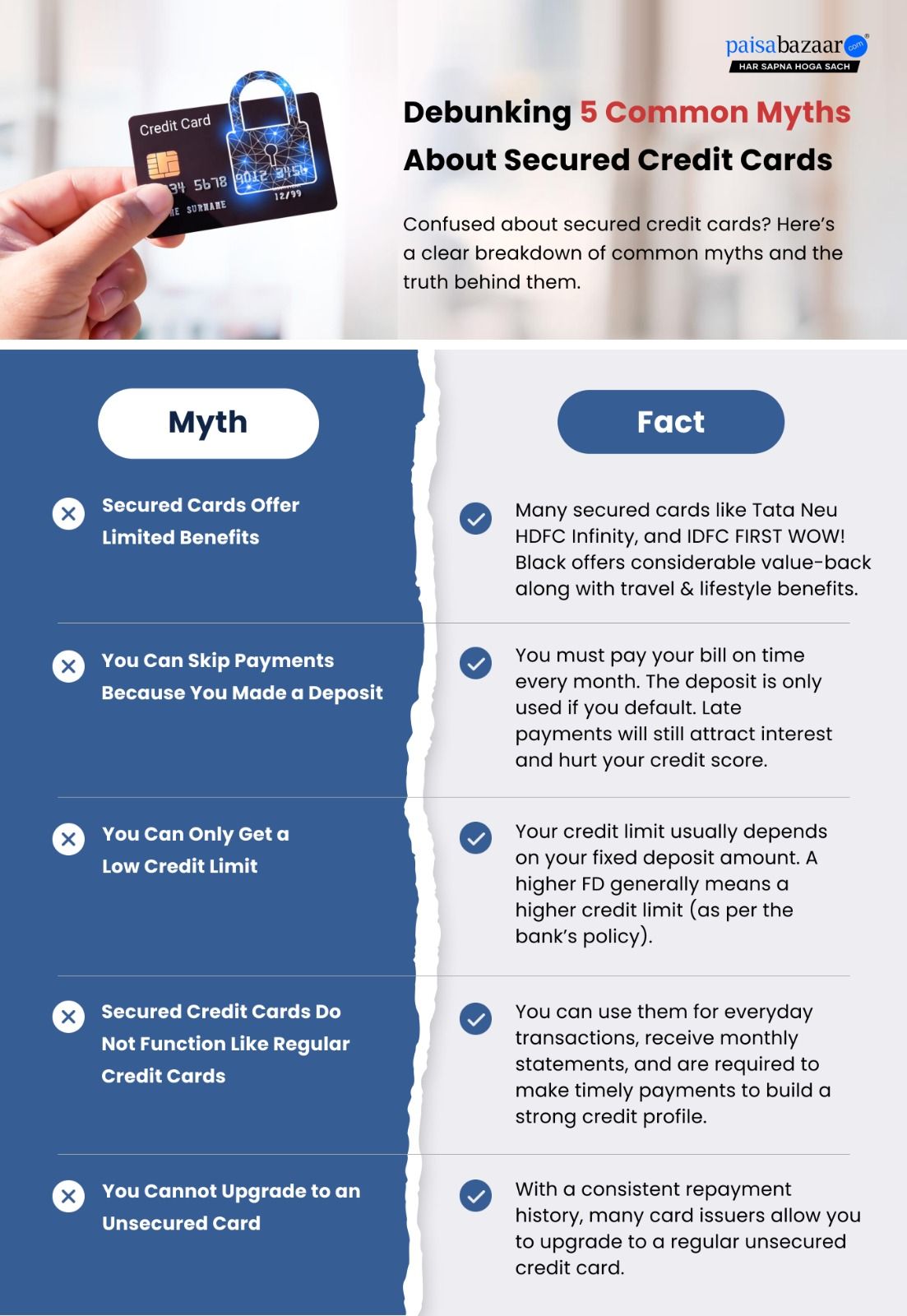 Reality: Many secured cards, such as TATA Neu, HDFC Infinity, and IDFC First WOW! Black, offers value beyond basic credit building. Along with helping you establish a strong credit history, these cards offer rewards, cashback, travel perks, and lifestyle benefits. Cardholders can avail discounts on dining, shopping, and entertainment, as well as access to exclusive experiences and offers.