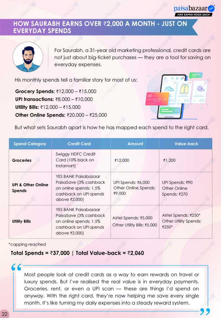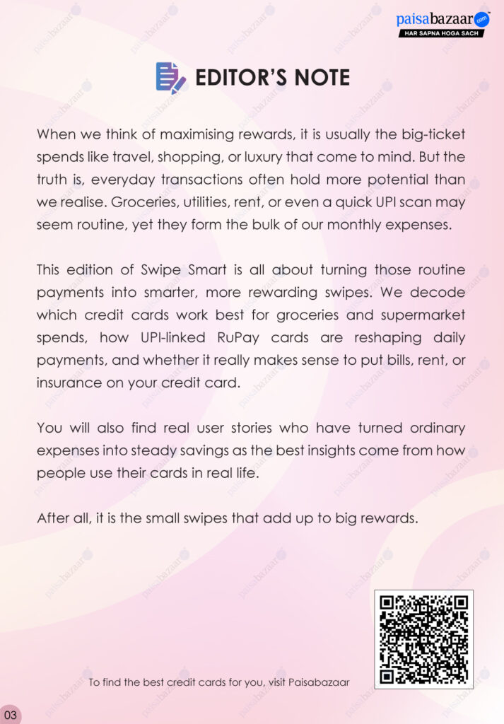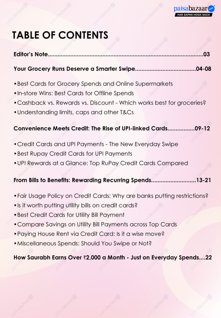 The Everyday Spends Edition explores how routine payments like groceries, utilities, rent, and UPI transactions can become powerful tools for savings. Inside, you’ll find the best cards for daily spends, value-back comparisons across top RuPay and bank cards, insights on fair usage policies, and practical strategies to turn everyday payments into everyday rewards.