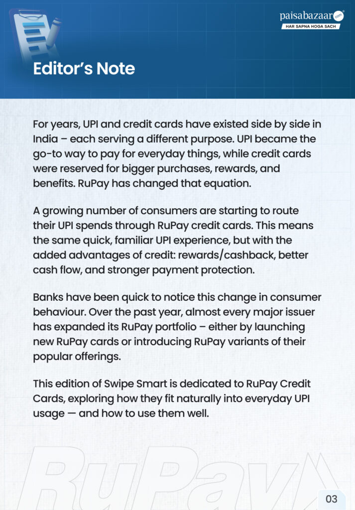 The RuPay Edition explores how RuPay credit cards are transforming everyday UPI payments by bringing credit, rewards, and protection into daily spends. Inside, you’ll find a simple guide to using RuPay cards on UPI, key benefits to know, and tips to make the most of your everyday payments. Read the complete newsletter here.