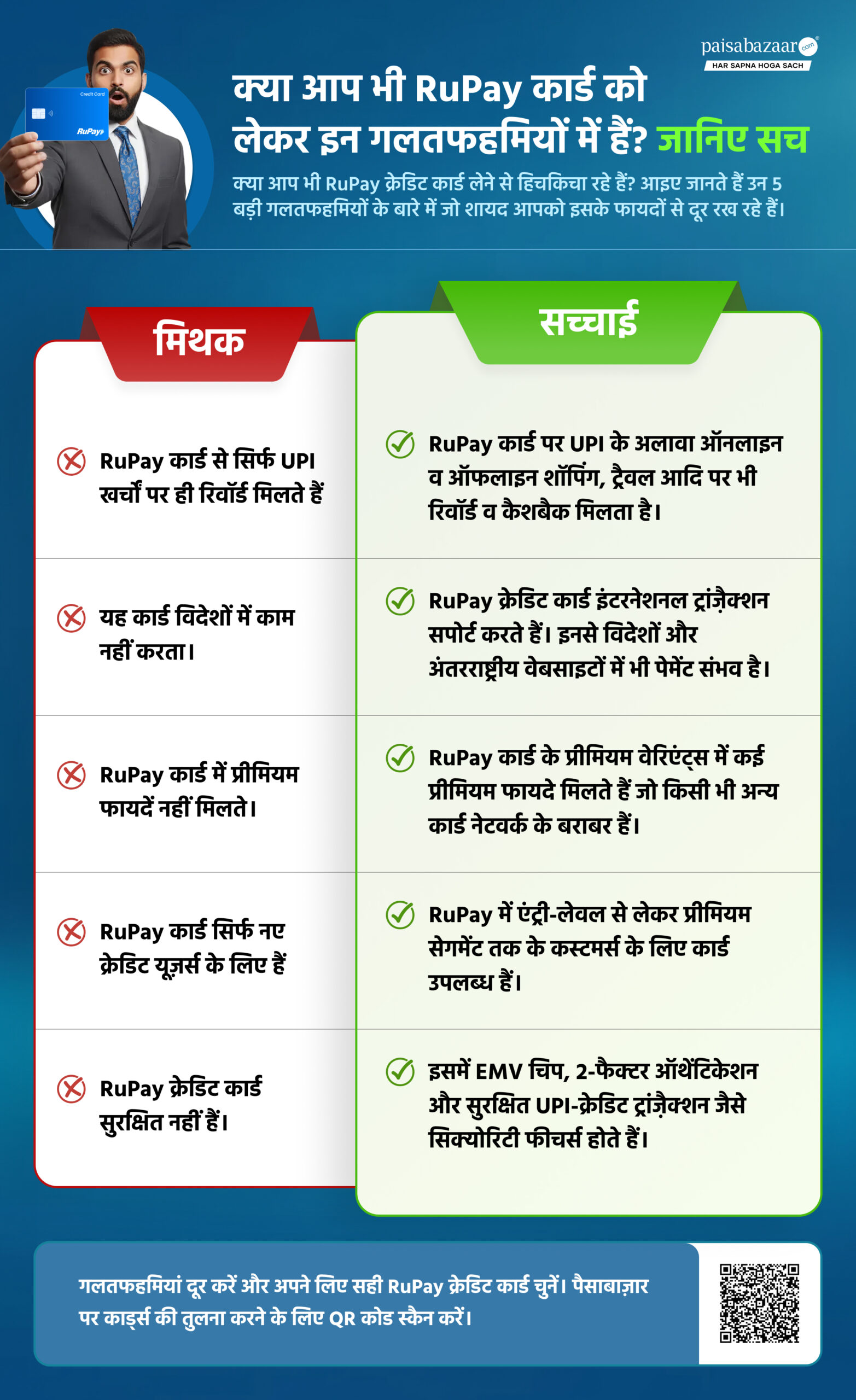 हालांकि, इन फायदों के बावजूद रुपे क्रेडिट कार्ड को लेकर लोगों के बीच कई गलतफहमियां भी हैं। चलिए इन गलतफहमियों और इनकी सच्चाई जानते हैं जिससे आप सूचित निर्णय ले सकें।