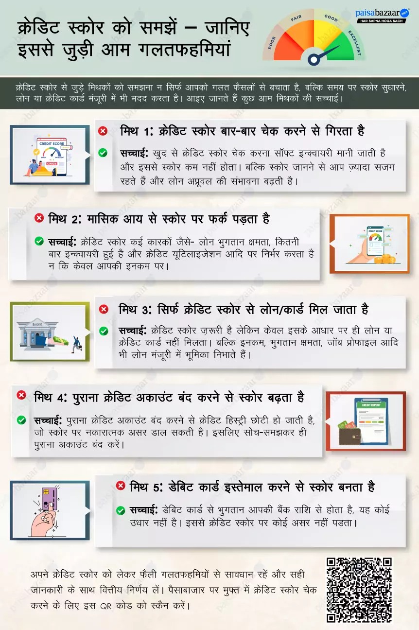 क्रेडिट स्कोर उन महत्वपूर्ण योग्यता शर्तों में से एक है जो लोन या क्रेडिट कार्ड लेने के लिए आवश्यक है। जब भी आप लोन/क्रेडिट कार्ड के लिए आवेदन करते हैं बैंक/NBFC सबसे पहले आपका क्रेडिट स्कोर (Credit Score) चेक करते हैं। स्कोर अच्छा होने पर लोन या क्रेडिट कार्ड मिलना आसान हो जाता है वो भी कम ब्याज दर पर। इसलिए क्रेडिट स्कोर से जुड़ी झूठ और गलतफहमियां से बचना चाहिए ताकि आप क्रेडिट स्कोर बना/सुधार कर सके और भविष्य में अच्छा क्रेडिट स्कोर होने का लाभ उठा सके। तो चलिए क्रेडिट स्कोर से जुड़ी आम गलतफहमियों के बारे में जानते हैं: