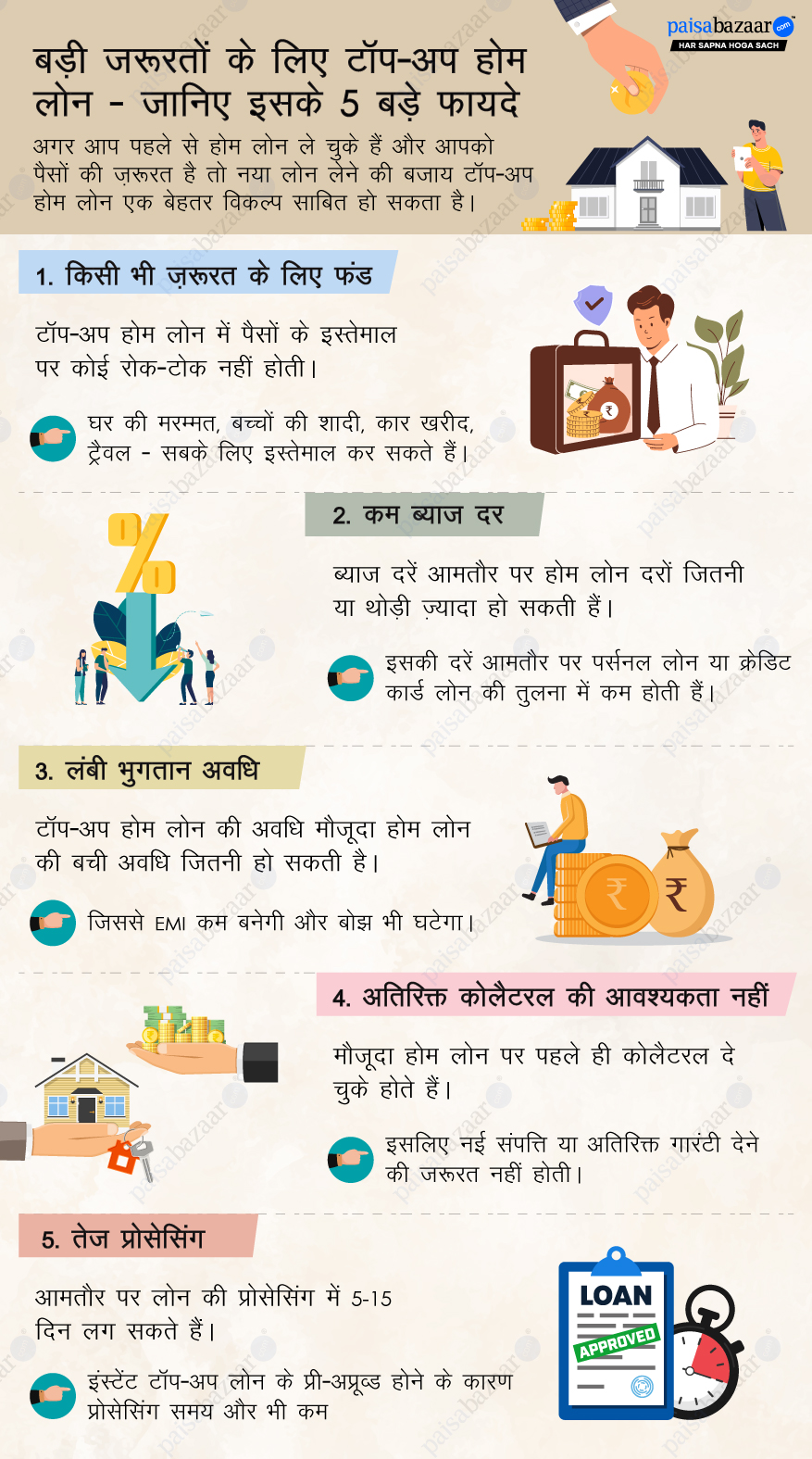 आमतौर पर टॉप-अप होम लोन की प्रोसेसिंग पर्सनल लोन या क्रेडिट कार्ड लोन से थोड़ी लंबी हो सकती है। लोन अगेंस्ट क्रेडिट कार्ड के मामले में लोन राशि आमतौर पर आवेदन के दिन ही डिसबर्स कर दी जाती है। जबकि पर्सनल लोन के डिसबर्सल में 2-7 दिन का समय लग सकता है। हालांकि, कई बैंक अपने मौजूदा ग्राहकों को प्री-अप्रूव्ड टॉप-अप लोन ऑफर करते हैं, जो आवेदन के उसी दिन डिसबर्स हो सकते हैं। ऐसे में देखा जाएगा तो प्री-अप्रूव्ड टॉप-अप लोन तेज़ डिसबर्सल के मामले में पर्सनल लोन और क्रेडिट कार्ड लोन को टक्कर देते हैं।